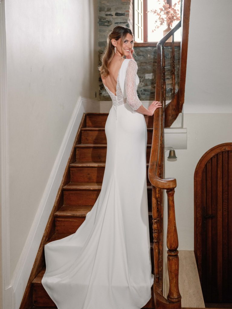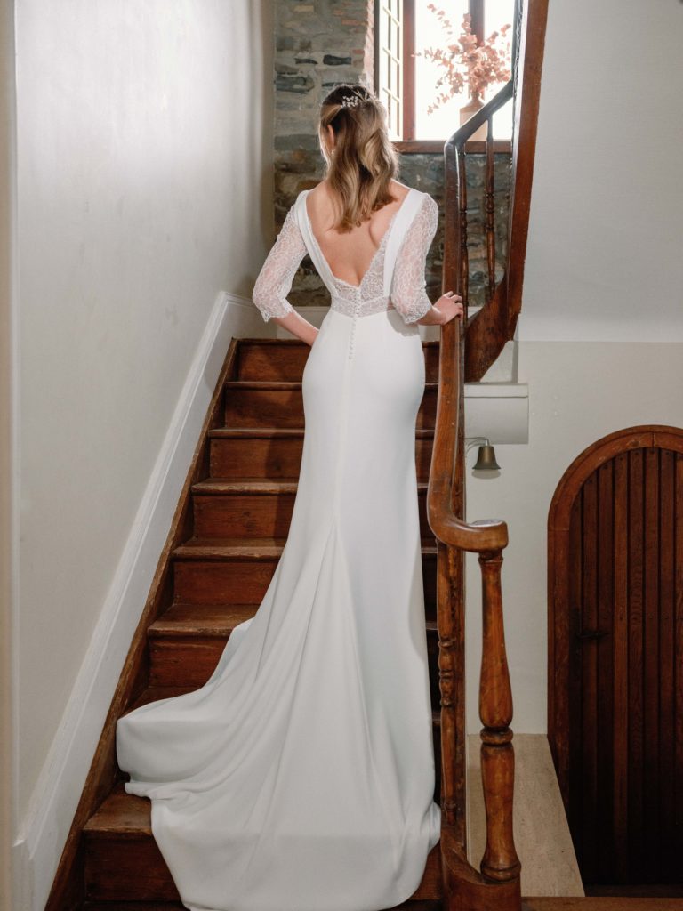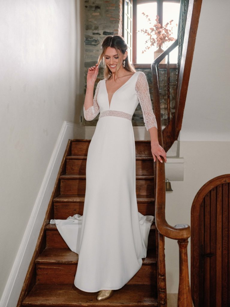 Superbe robe en crêpe et dentelle brillante de la marque Angéola. La dentelle est brillante.