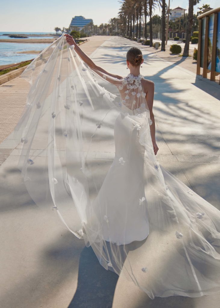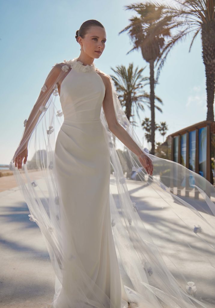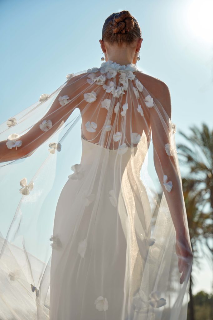 Toute la robe est en satin souple. Les fleurs de la cape sont en relief.