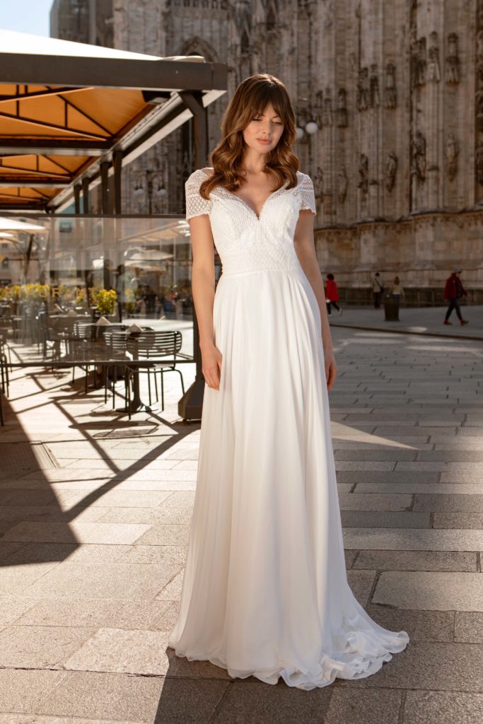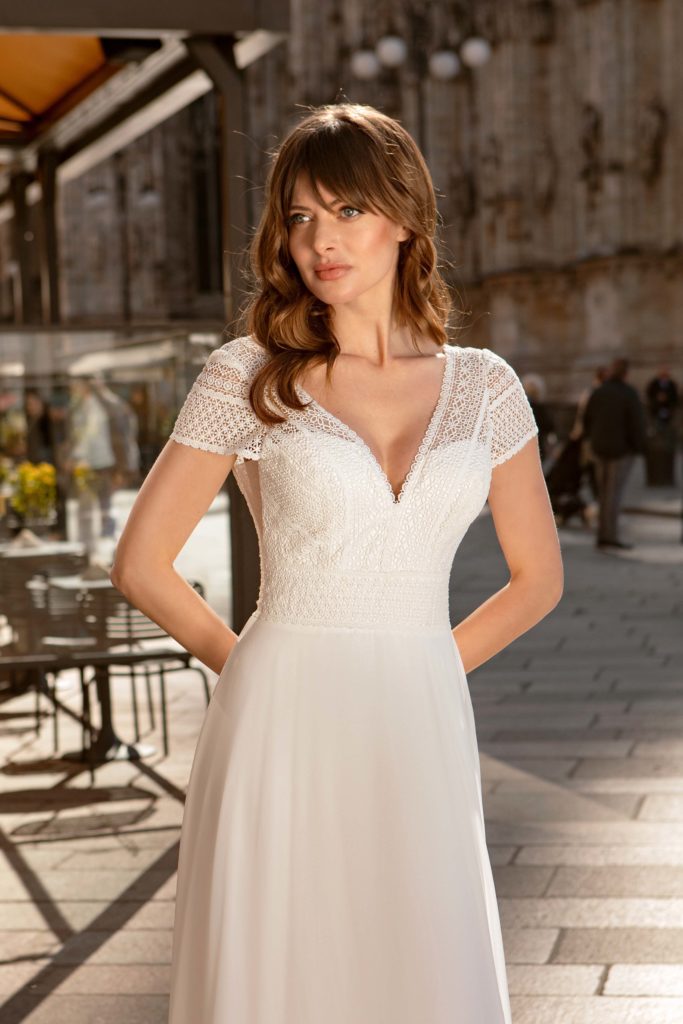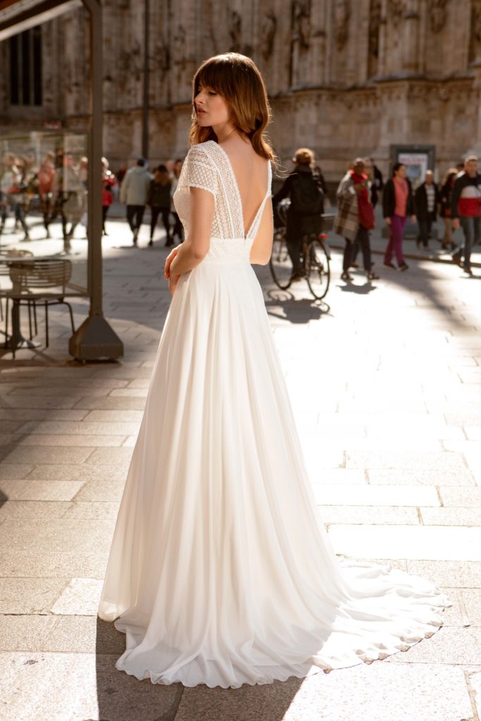 Petite robe en voile avec un profond décolleté en dentelle dans le dos.