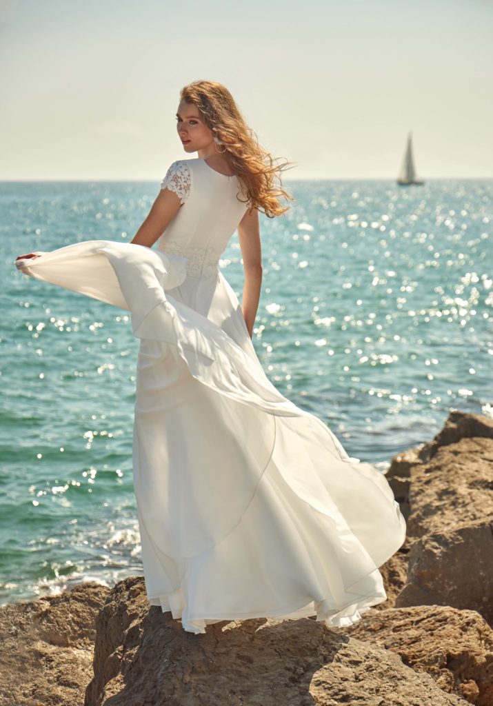 La taille est soulignée par une dentelle fleurie que vous retrouverez en manchette.
