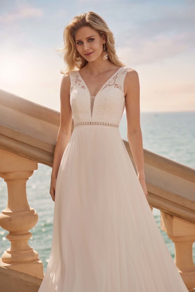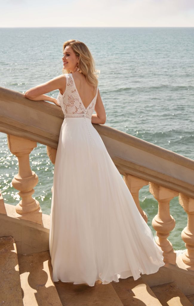 Superbe robe en voile et dentelle de la collection créatif! Le dos est fermé en forme de “v” avec de la dentelle.