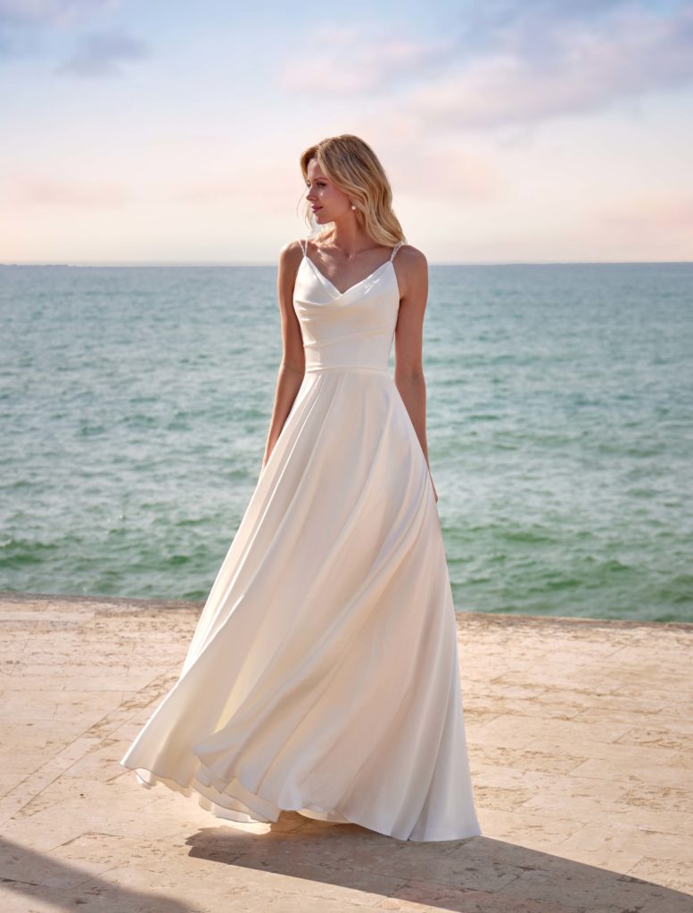 Cette robe toute en simplicité saura vous séduire par son tomber parfait au niveau du buste avec un joli travail de drapé.