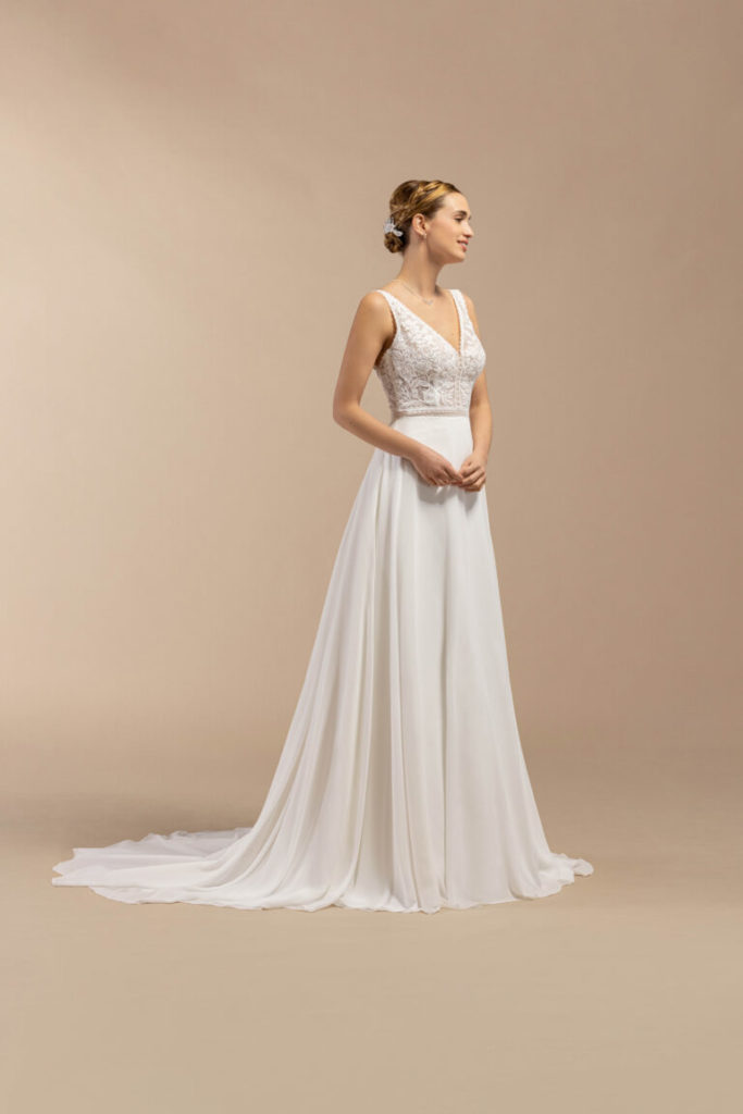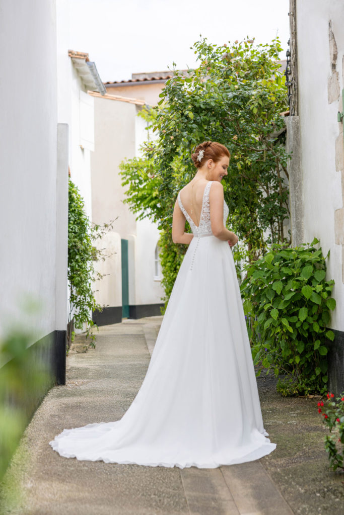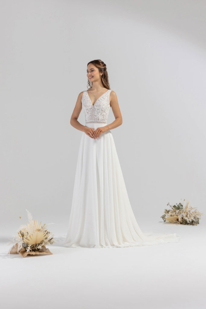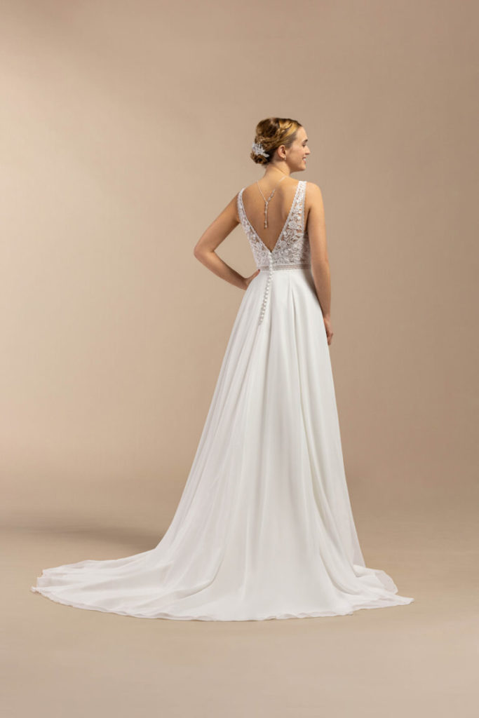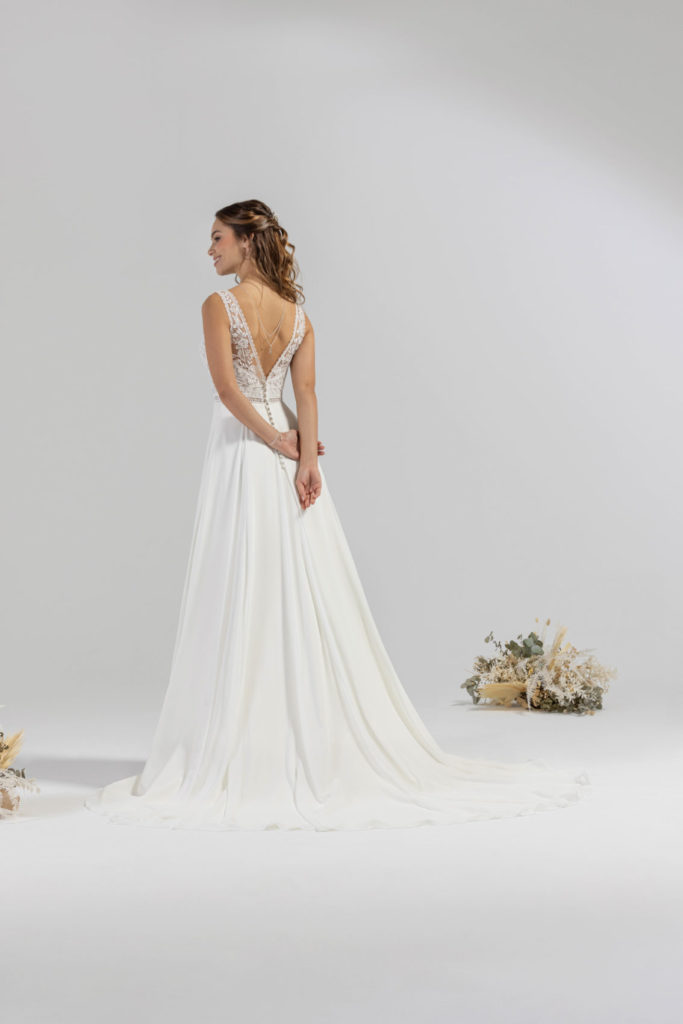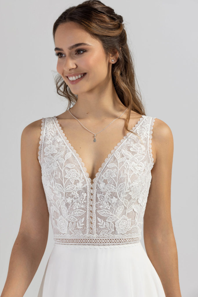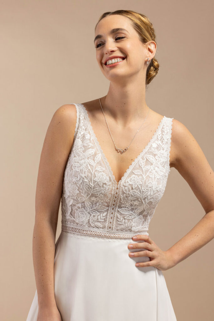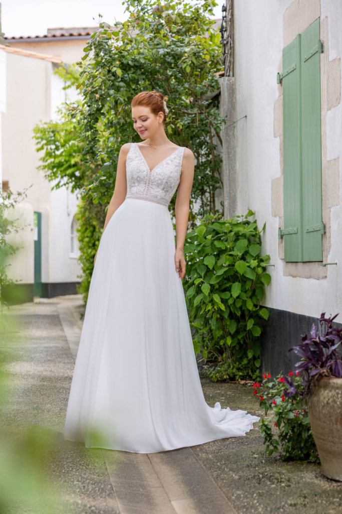 Ravissante robe fluide à la coupe trapèze et flatteuse. Très légère avec sa jupe en mousseline, elle joue sur le charme de la dentelle Chantilly et de la guipure pour souligner les courbes du buste.