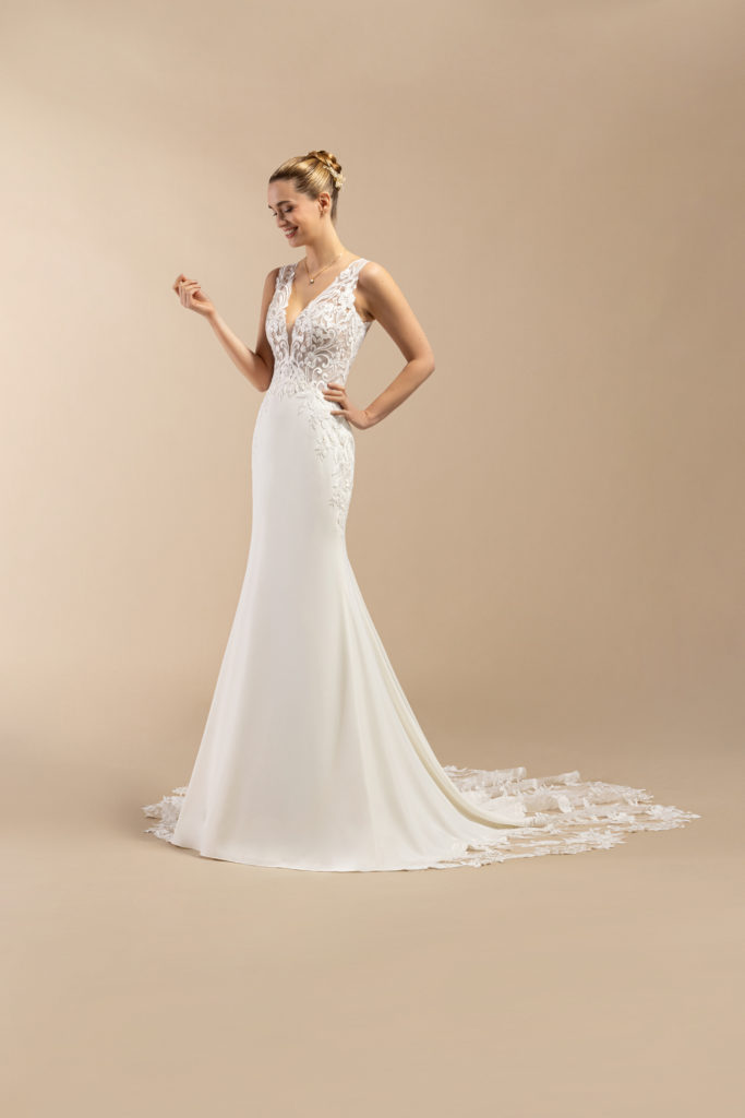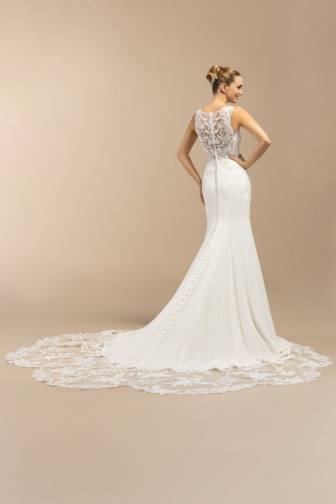 Vous l’aimerez pour sa coupe parfaite et ses détails de dentelle notamment sur la traîne!