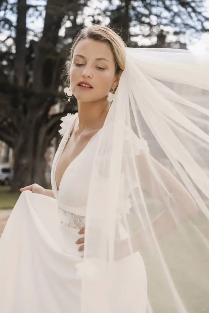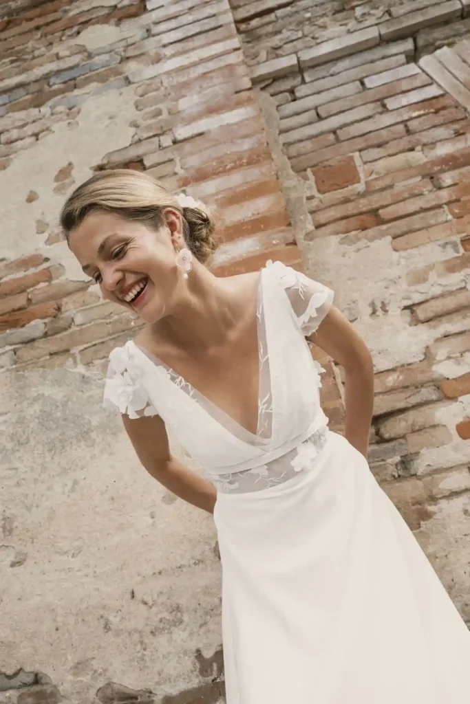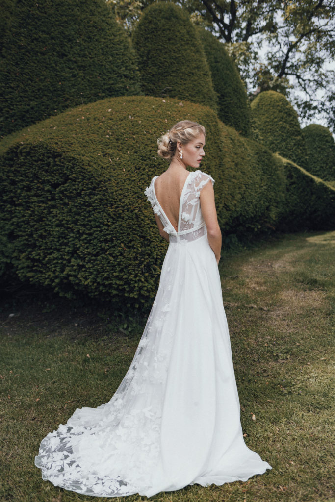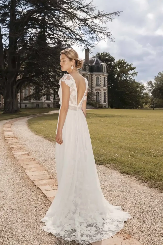 Vous aimez les fleurs ? Le décolleté est plissé avec des incrustations de fleurs soigneusement cousues, la ceinture qui épouse la taille et la mousseline apporte la légèreté et au dos la magie opère grâce à cette magnifique cascade de fleurs.