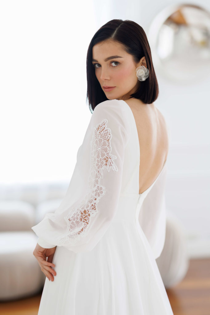 Vous n’aimez pas l’ajouré de dentelle sur les manches? Ce n’est pas un souci, nous pourrons vous les faire confectionner entièrement en voile.