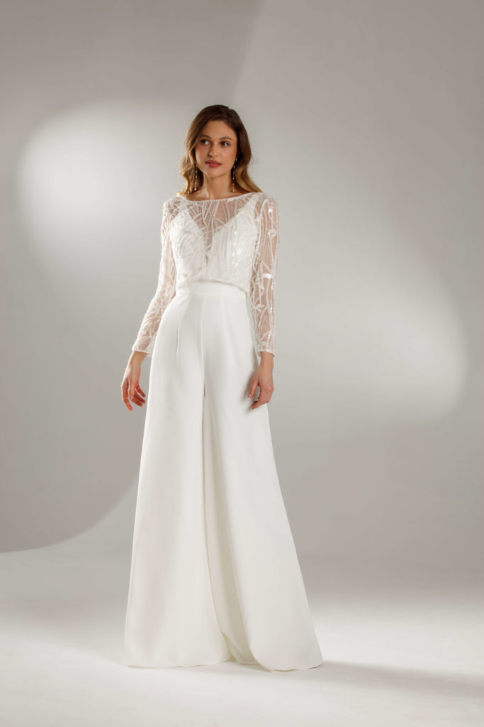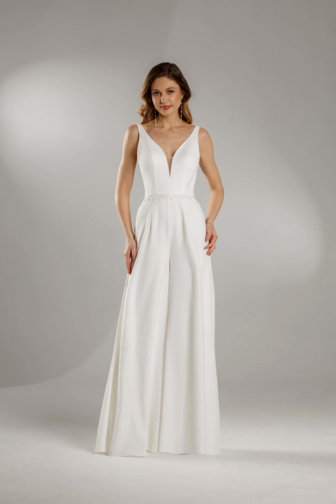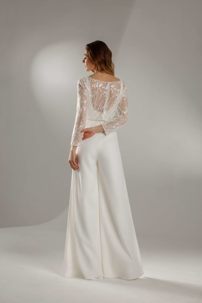 Nefeli est un ensemble pantalon en crêpe. Une ceinture de strass vient souligner votre taille.