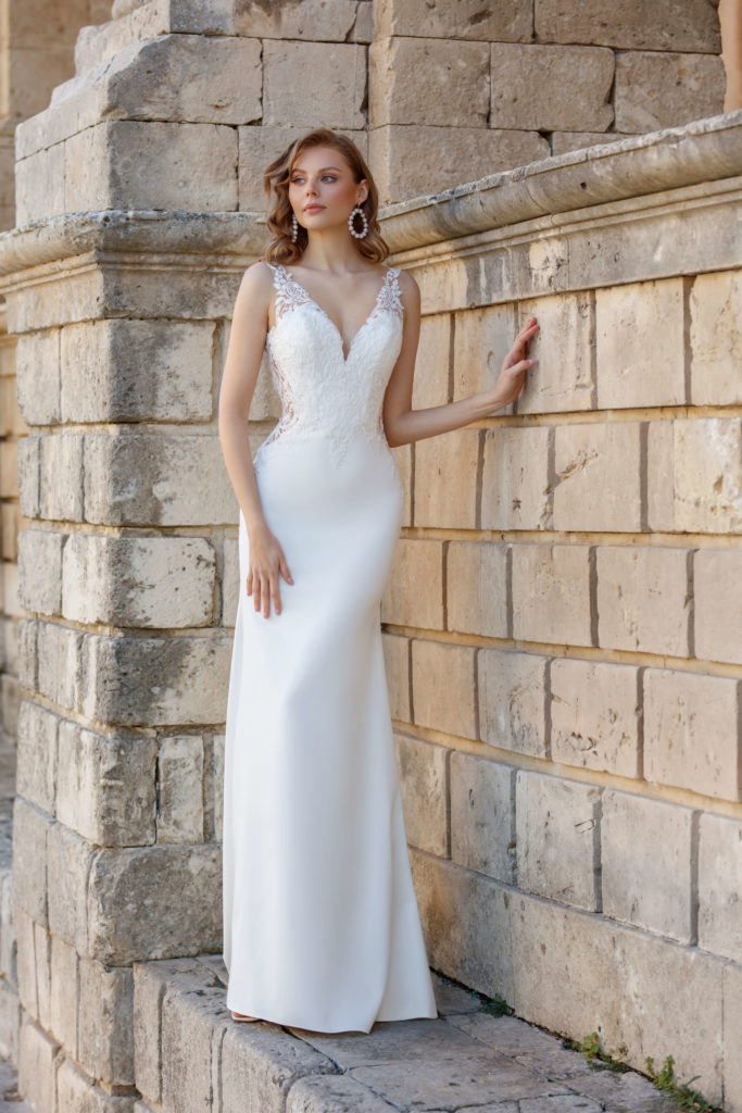Composée de satin élastiqué, la jupe de cette création est légèrement en coupe sirène. Elle s’évase ensuite vers le bas pour offrir une traîne en dentelle.
