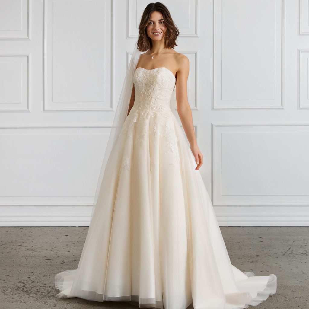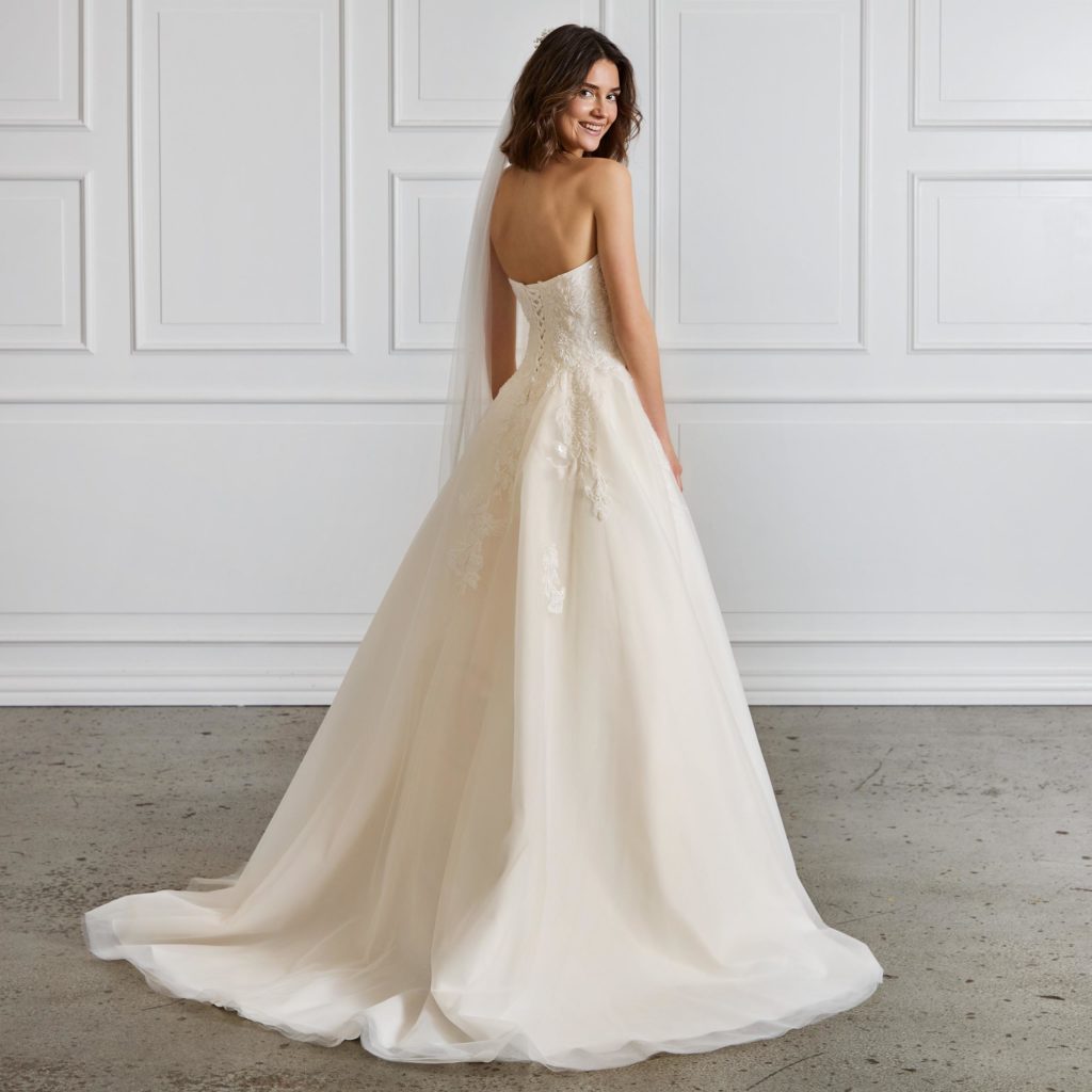 La robe est ornée de dentelle perlée, un vrai bijoux! La robe est de couleur légèrement pêche.