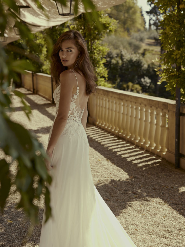 La robe se compose d’un haut en dentelle maintenu par de fines bretelles. La dentelle decend un peu sur la jupe qui est en voile.
