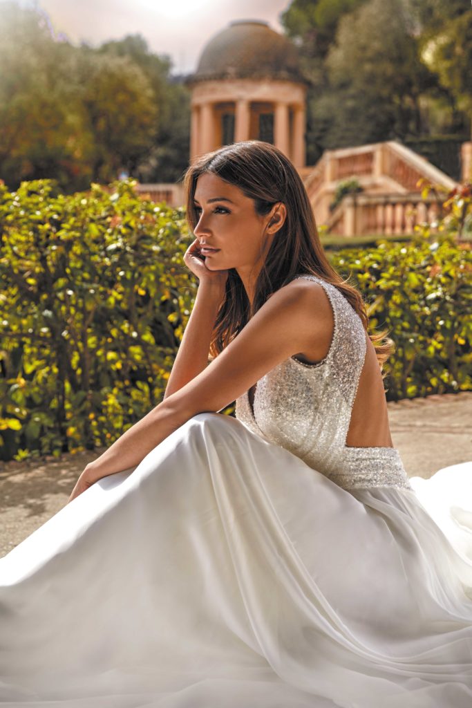 Le haut est entièrement recouvert de sequins. Le bas est satin fluide brillant.