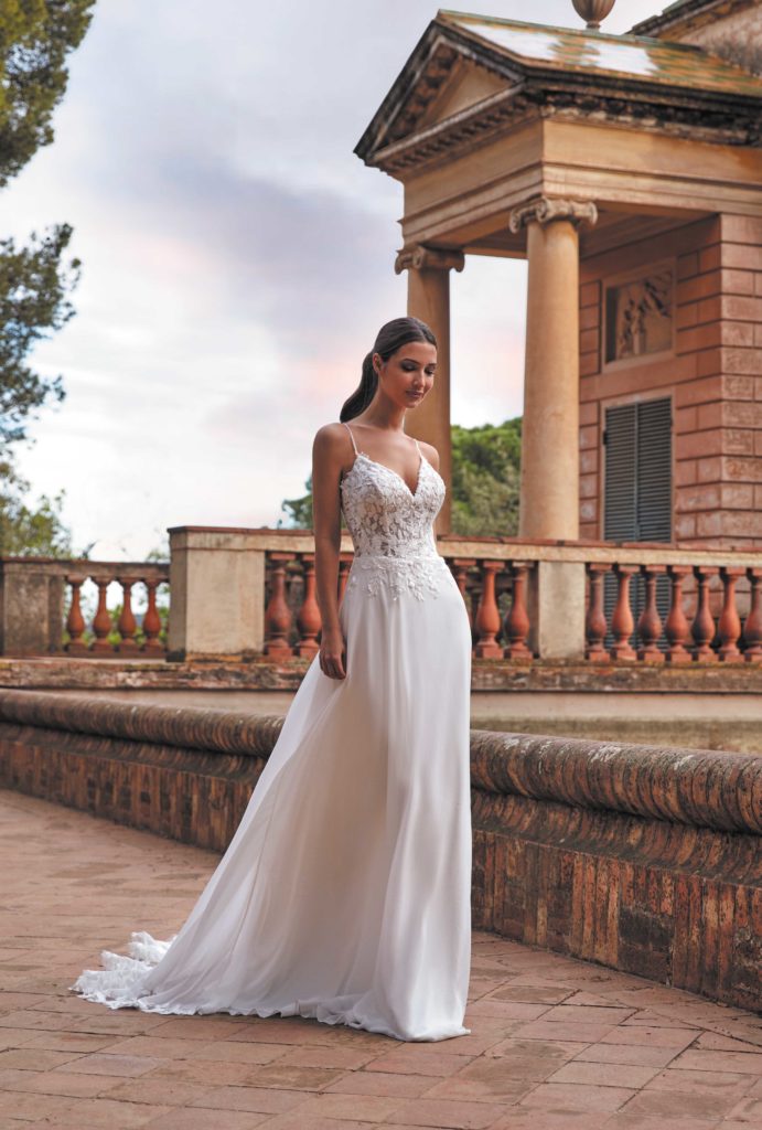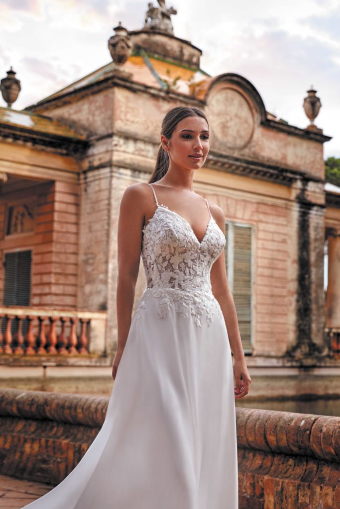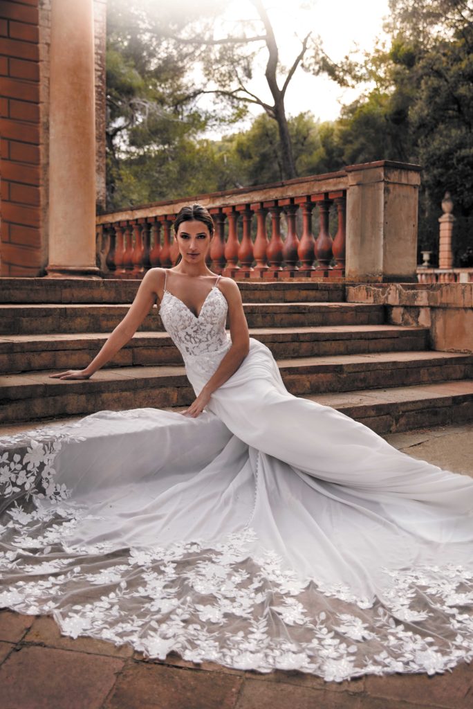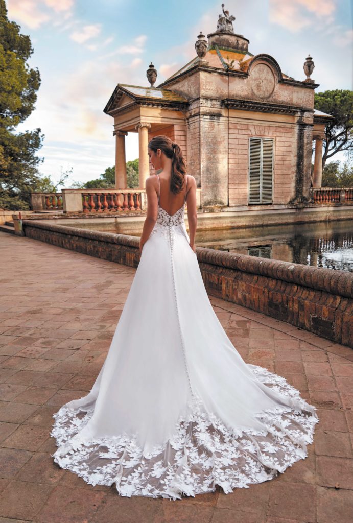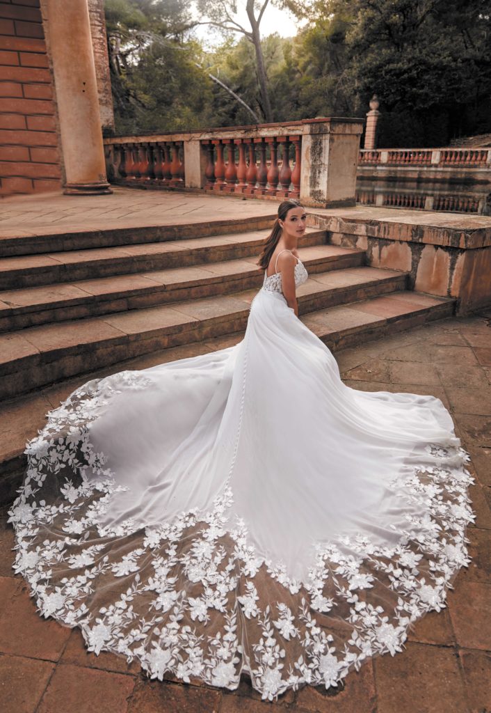 Son haut est composé d’un bustier transparent en dentelle sur tulle chair. Sa jupe en voile se termine de façon spectaculaire par une longue traîne en dentelle.