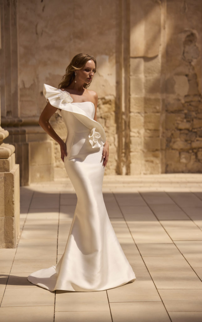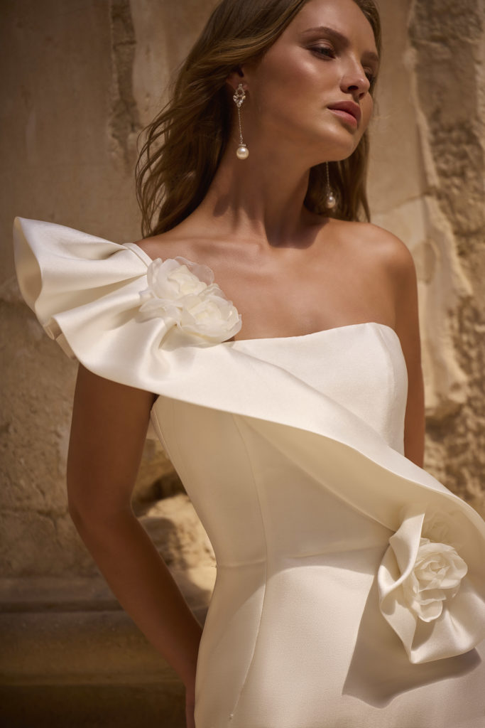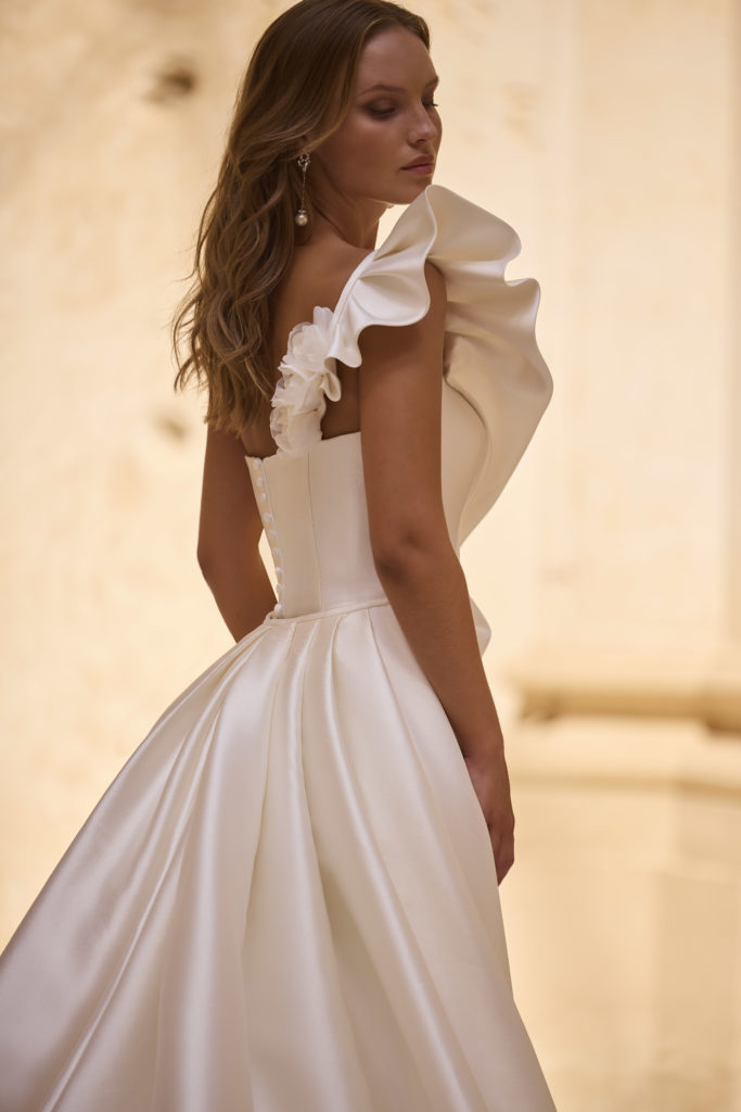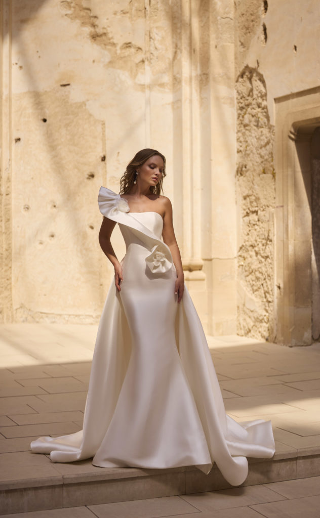 La sur traîne est amovible et la robe est entièrement confectionnée en mikado.